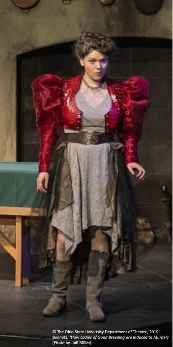 Mrs. Wolcott’s jacket. For Bonnets: (How Women of Good Breeding are Induced to Murder) at The Ohio State University, I stitched together this jacket for the character Mrs. Wolcott. This jacket has mutton sleeves and was created using faux alligator, cotton, and sheer fabrics.